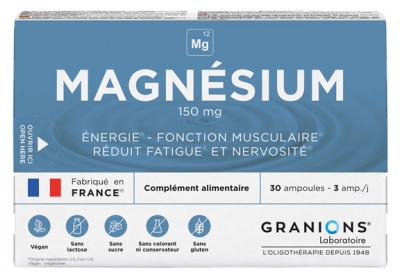 Granions Magnesium 30 Phials is a food supplement based on Magnesium, that contributes to reduce fatigue, normal muscle function and to normal functioning of nervous system.